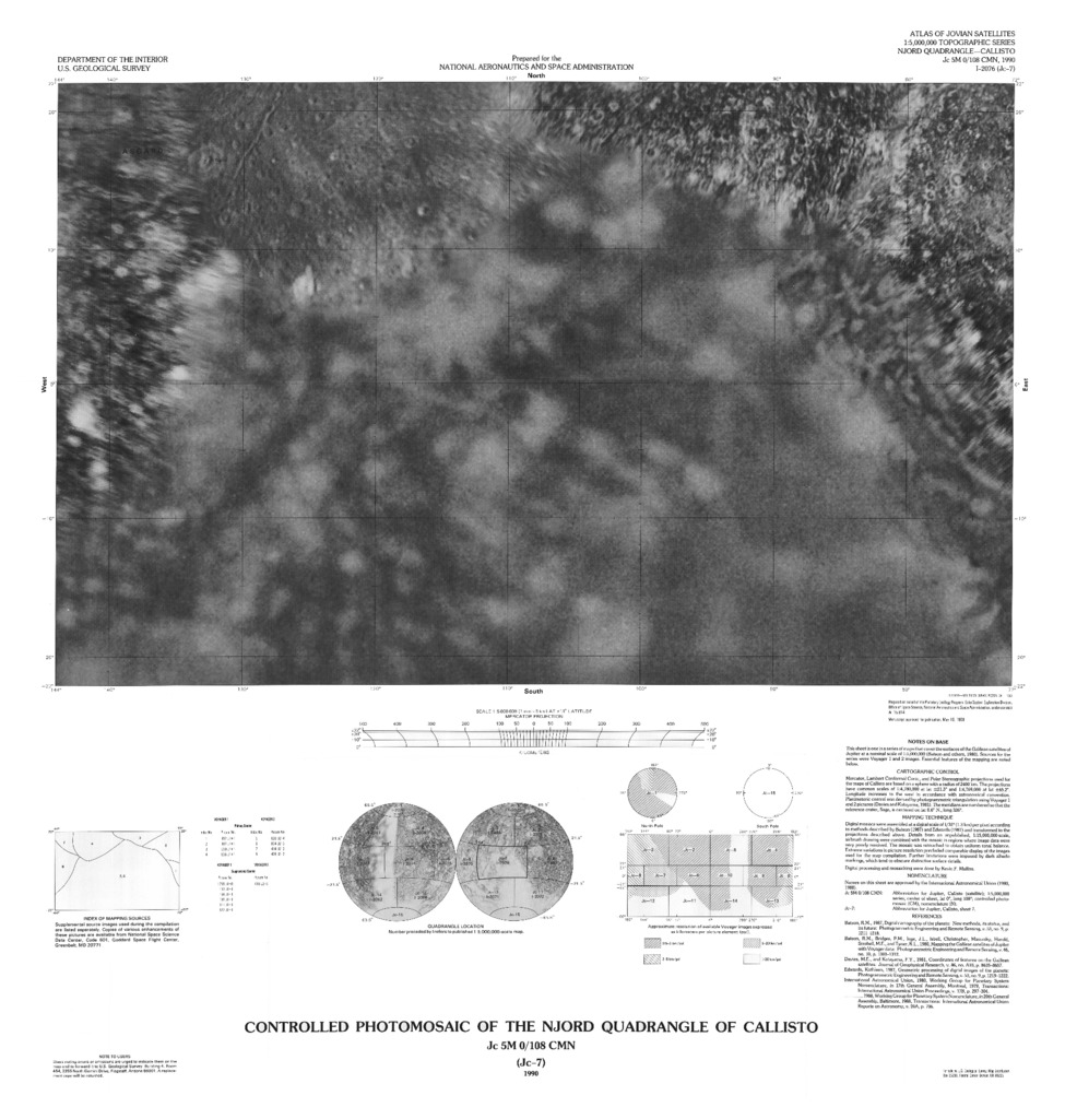 - This sheet is one in a series of maps that covers the surface of Galilean satellites of Jupiter at nominal scale of 1:5,000,000(Batson and others, 1980). Sources for the series were Voyager 1 and 2 images. Essential features of the mapping are noted below. Cartographic Control Mercator, Lambert Conformal Conic, and Polar Stereographic projections used for the maps of Callisto are based on a sphere with a radius of 2400km. The projections have common scales of 1:4,780,000 at lat ±21.3Ë and 1:4,769,000 at lat ±65.2Ë. Longitude increases to the west in accordance with the astronomical convention. Planimetric control was derived by photogrammetric triangulation using Voyager 1 and 2 pictures (Davies and Katayama, 1981). The meridians are numbered so that the reference crater, Saga is centered on lat 0.6ËN., long 326Ë. Mapping Technique Digital mosaics were assembled at a digital scale of 1/32Ë (1.3km) per pixel according to methods described by Batson (1987) and Edwards (1987) and transformed to the projections described above. Details from an unpublished, 1:15,000,000-scale, airbrush drawing were combined with the mosaic in regions where the image data were very poorly resolved. The mosaic was retouched to obtain uniform tonal balance. Extreme variations in picture resolution precluded comparable display of the images used for the map compilation. Further limitations were imposed by dark albedo markings, which tend to obscure distinctive surface details. Digital processing and mosaicking were done by Kevin F. Mullins. References: Batson, R.M., Bridges, P.M., Inge, J.L. Isabell, Christopher, Masursky, Harold, Strobell, M.E., and Tyner, R.L., 1980, Mapping the Galilean satellites of Jupiter with Voyager data: Photogrammetric Engineering and Remote Sensing, v. 46, n0. 10, p.1303-1312. Batson, R.M., 1987, Digital cartography of the planets: New methods, its status, and its future: Photogrammetric Engineering and Remote Sensing, v.46, no. 10, p. 1303-1312 Davies, M.E., and Katayama, F.Y., 1981, Coordinates of features on the Galilean Satellites: Journal of Geophysical Research, v.86, no. A10, p.8635-8657. Edwards, Kathleen, 1987, Geometric processing of digital images of the planets: Photogrammetric Engineering and Remote Sensing, v.53, no.9, p. 1219-1222